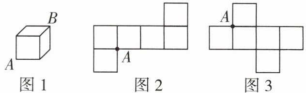 7 图1中,A为正方体的顶点,在另一顶点B处有一昆虫.图2、图3是正方体的两种不同的平面展开图,根据A,B位置的特点,请你在图2、图3中分别标出昆虫的位置(用字母B表示).