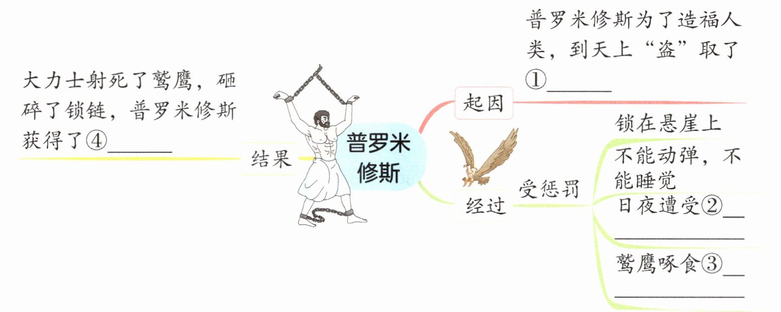 (注:因无法直接在图片中圈画,此处默认已按答案①火种、②风吹雨淋、③肝脏、④自由完成脉络梳理)