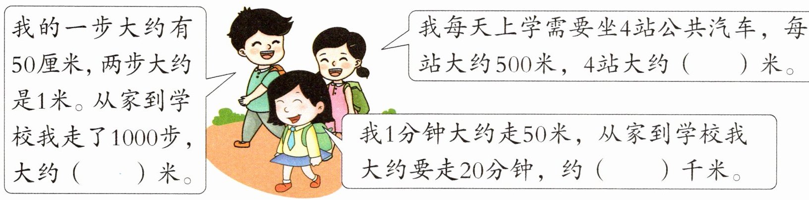小梦: 两步大约是 1 米, 那么走 4000 步大约走 2000 米。妈妈: 500 + 500 + 500 + 500 + 500 = 2500 (米) 2000 < 2500 出发前妈妈离公园更远。