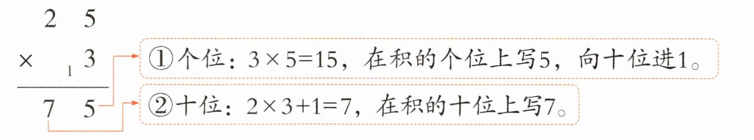 【解析】:求几个相同加数的和的简便运算用乘法,这里求$3$个$25$是多少,用乘法计算合理,方法一利用数的组成将$25$拆分为$20$与$5$分别乘$3$再相加,方法二用竖式计算,个位$3×5 = 15$,个位写$5$向十位进$1$,十位$2×3+1 = 7$,计算过程正确。