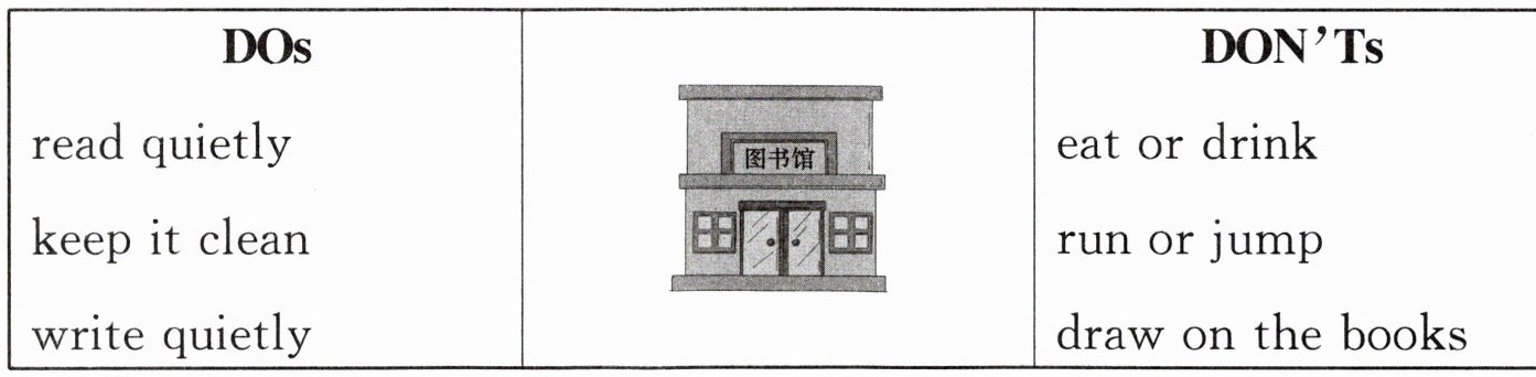 Look, it's a library at school. It is not big. But it is very nice. We go to the library this afternoon. We can see many signs in the library. Look, there are some “DOs” and “DON'Ts” in it. We should follow the rules.
