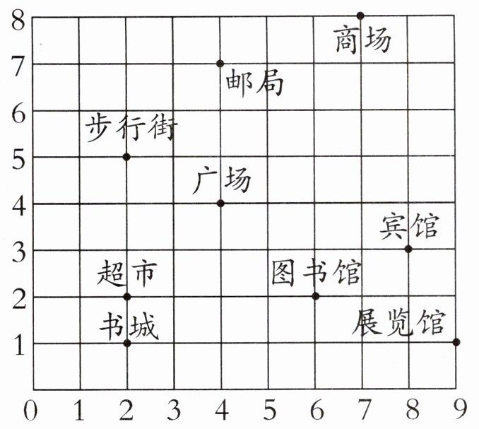 3. (1)展览馆的位置是(,),图书馆的位置是(,),邮局的位置是(,),广场的位置是(,)。