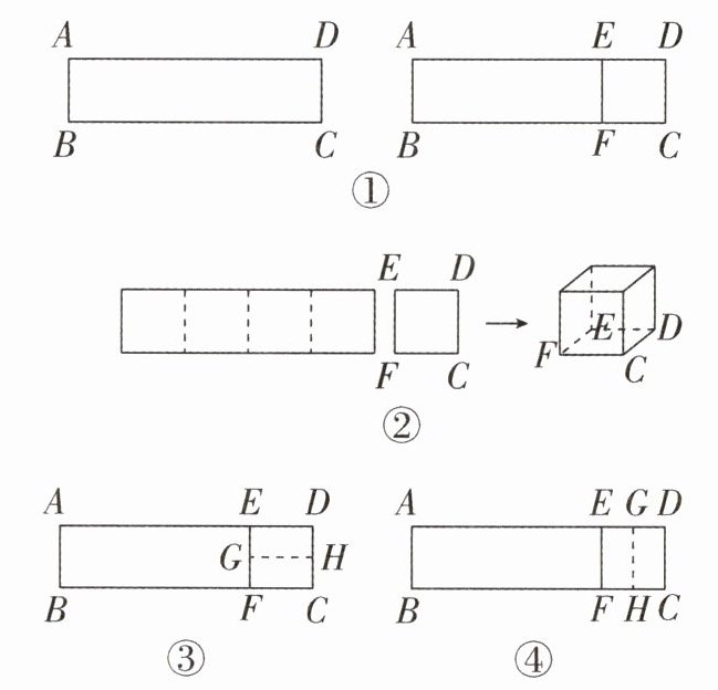 (2)如图③、④所示,用 EF 把长方形 ABCD 分成 2 个长方形,将长方形 ABFE 折叠成纸盒的侧面,将长方形 CDEF 沿 GH 剪成两部分,分别做纸盒的上、下底面,做成一个有盖的长方体纸盒.