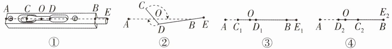 2. (2024·盐城期末)如图①,一款暗插销由外壳AB、开关CD、锁芯DE三部分组成,其工作原理如图②,开关CD绕固定点O转动,由连接点D带动锁芯DE移动.图③为插销开启状态,此时连接点D在线段AB上,如$D_{1}$位置.开关CD绕点O顺时针旋转$180^{\circ}后得到C_{2}D_{2}$,锁芯弹回至$D_{2}E_{2}$位置(点B与点$E_{2}$重合),此时插销闭合如图④.已知$CD = 72mm$,$AD_{2}-AC_{1}= 50mm$,则$BE_{1}= $______mm.