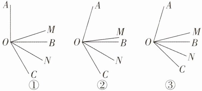 (1)如题图①,因为∠AOB=90°,∠BOC=60°,所以∠AOC=90°+60°=150°.因为 OM 平分∠AOC,ON 平分∠BOC,所以∠MOC=$\frac{1}{2}$∠AOC=75°,∠NOC=$\frac{1}{2}$∠BOC=30°,所以∠MON=∠MOC-∠NOC=45°.
