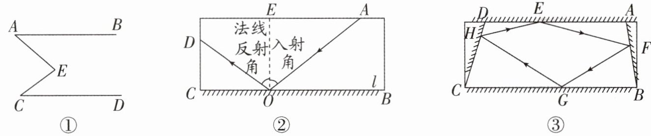 ②如图③,在长方体盒子里放置4块平面镜AB,BC,CD,DA,其中AD//CB,若光线从AD上的E处射出,在平面镜AB上经点F反射后,到达BC上的点G……其传播路径为E→F→G→H→E→F……请判断∠EFG与∠GHE的数量关系,并说明理由。