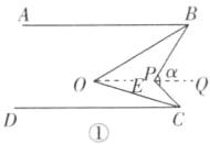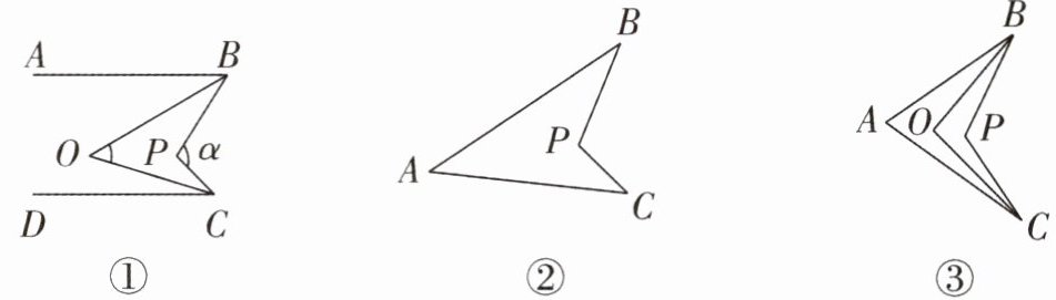 (1)①$\frac{\alpha}{2}$ ②$\frac{\alpha}{3}$ ③$\frac{\alpha}{n}$ 解析:①如图①,分别过点O,P作OE//AB,PQ//AB,因为AB//CD,所以OE//PQ//AB//CD,所以∠ABP=∠BPQ,∠DCP=∠CPQ,∠ABO=∠BOE,∠DCO=∠COE,所以∠ABP+∠DCP=∠BPC,∠ABO+∠DCO=∠BOC.因为∠BPC=α,BO平分∠ABP,CO平分∠DCP,所以∠ABO=∠PBO=$\frac{1}{2}$∠ABP,∠DCO=∠PCO=$\frac{1}{2}$∠DCP,所以∠BOC=$\frac{1}{2}$∠ABP+$\frac{1}{2}$∠DCP=$\frac{1}{2}$(∠ABP+∠DCP)=$\frac{\alpha}{2}$.