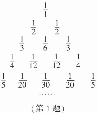 1. (2025·昆明期中)如图所示的数阵叫“莱布尼兹调和三角形”,它是由正整数的倒数组成的,第n行有n个数且两端的数均为$\frac {1}{n}(n≥2)$,每个数是它下一行左右相邻两数的和,如$\frac {1}{1}= \frac {1}{2}+$$\frac {1}{2},\frac {1}{2}= \frac {1}{3}+\frac {1}{6},\frac {1}{3}= \frac {1}{4}+\frac {1}{12},... $,那么第7行第3 个数为(