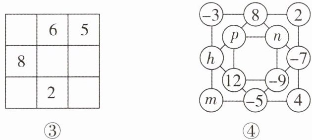 (3)如图④,有3个正方形,每个正方形的顶点处都有一个“$◯$”.将-11,-9,-7,-5,-3,-1,2,4,6,8,10,12这12个数填入恰当的位置(数不重复使用),使每个正方形的4个顶点的“$◯$”中的数的和都相等,则$mn$= ______.(注:$mn= m× n$)