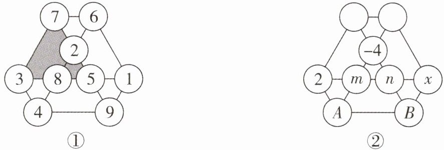 2. 数学文化幻方的历史悠久,传说最早出现在夏禹时代的“洛书”中.有一种特殊的三角形幻方,是由4个较小的三角形和3个较大的三角形构成的,且满足每个三角形三个顶点处的数之和相等.如图①是这种特殊三角形幻方,阴影部分的三角形三个顶点处的数之和为7+3+5= 15,该图中每个三角形三个顶点处的数字之和都为15,图②也是这种特殊的三角形幻方.