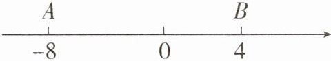 (2)设 t 秒后,A,B 到原点的距离相等.因为 $OA+OB=8+4=12>6$,且点 A 的运动速度大于点 B 的运动速度,所以分两种情况.①当点 B 在点 A 的右侧时,$8-2t=4+t$,解得 $t=\frac{4}{3}$.②当点 A 与点 B 重合时,$-8+2t=4+t$,解得 $t=12$.综合①②得,$\frac{4}{3}$ 秒和 12 秒时,A,B 两点到原点的距离相等.