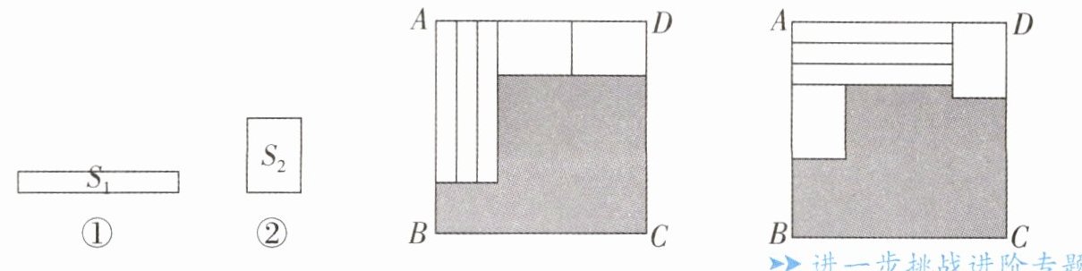 5. (2024·苏州校级月考)如图,用三个图①的长方形和两个图②的长方形按两种方式去覆盖同一个大的长方形$ABCD$,两种方式未覆盖的部分(阴影部分)的周长一样,那么图①长方形的面积$S_1$与图②长方形的面积$S_2$的比是______。