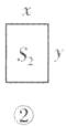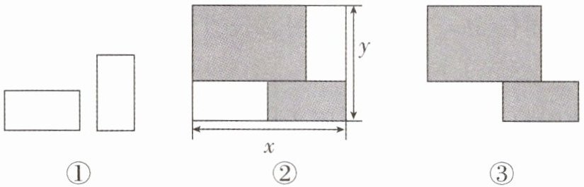 4. (2025·泰州校级期中)把两张形状、大小完全相同的小长方形卡片(如图①)不重叠地放在一个底面为长方形(长为$x$,宽为$y$)的盒子底部(如图②),盒子底面未被卡片覆盖的部分用阴影表示。阴影部分刚好能分割成两张形状大小不同的小长方形卡片(如图③),则分割后的两个阴影长方形的周长之和是______
