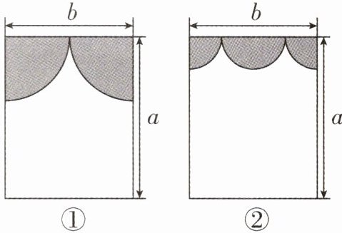(1)可知,题图①中窗帘的面积为$\frac{\pi b^{2}}{8}$,则题图①中射进阳光的面积为$ab - \frac{\pi b^{2}}{8}$,题图②中射进阳光的面积为$ab - \frac{\pi b^{2}}{16}$,$\left(ab - \frac{\pi b^{2}}{16}\right)-\left(ab - \frac{\pi b^{2}}{8}\right)=\frac{\pi b^{2}}{16}>0$,所以第二种方案射进阳光的面积更大