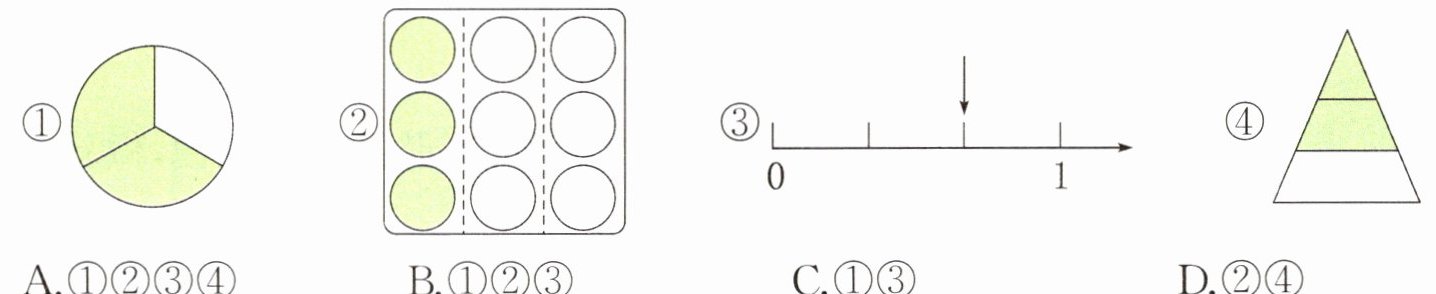 1. 下面各图中涂色部分或箭头所指的点能用$\frac{2}{3}$表示的是( )。