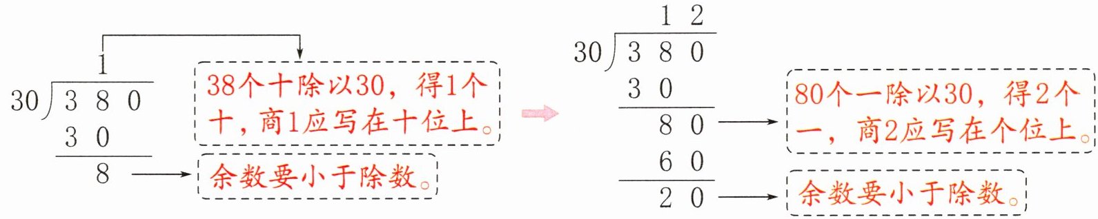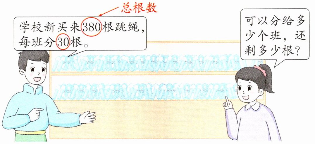 1. 每班分30根跳绳,求380根跳绳可以分给多少个班,就是求380里面有几个30,用除法计算,列式为$380÷30$。