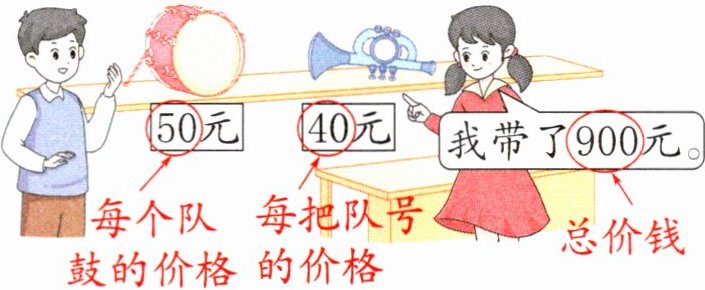 a. 已知每个队鼓50元,求900元可以买多少个队鼓,就是求900里面有多少个50,用除法计算,列式为$\underline{900÷50}$。
