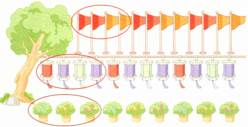 (1)图中盆花、彩灯和彩旗的排列有什么共同特点?