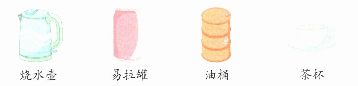 4. 估计下面各个容器的容量,在容量比1升大的容器下面画“√”,在容量比1升小的容器下面画“○”。