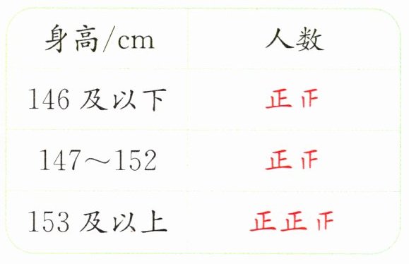 1. 理解题意:要想知道每种型号的服装各要购买多少套,统计出身高在146厘米及以下、147~152厘米、153厘米及以上的鼓号队员各有多少人即可。