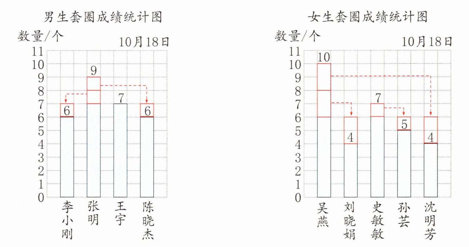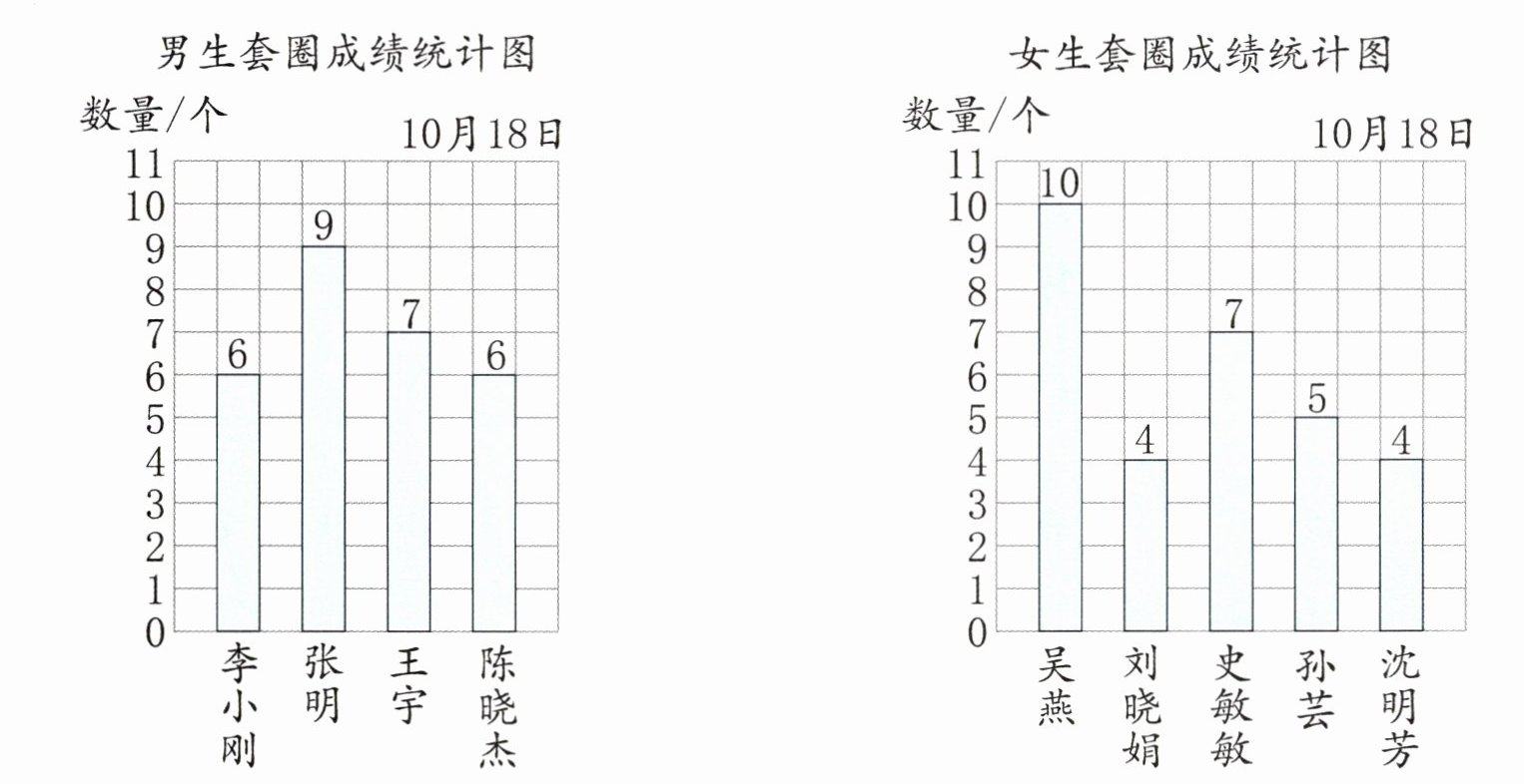 例题: 四年级第一小组的男、女生进行套圈比赛,每人套15个圈。下面的统计图表示他们套中的个数。