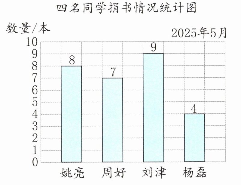 答:捐书本数比平均数少的同学是杨磊,少3本。