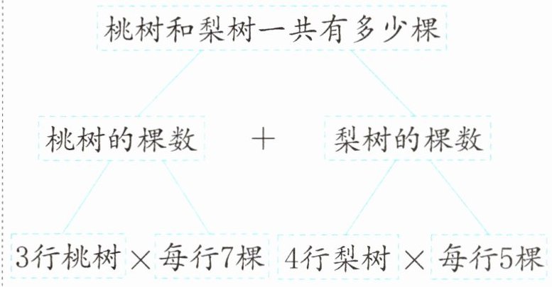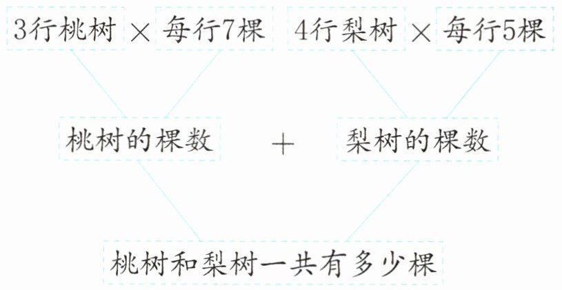 (1)桃树:$3×7=21$(棵) 梨树:$4×5=20$(棵) $21+20=41$(棵) 答:桃树和梨树一共有41棵。