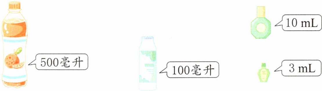 答案:图中 4 个容器的容量分别是 500 毫升、100 毫升、10 毫升和 3 毫升。“毫升(mL)”是容量单位,计量比较少的液体,通常用毫升作单位,毫升可以用字母“mL(ml)”表示。1 毫升水只有很少一点点,大约只有十几滴,比 1 升水少得多。