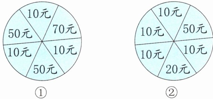 (1)选择①号转盘抽到50元代金券的可能性最大。因为两个转盘都被均分为6份,①号转盘中50元代金券占2份,②号转盘中50元代金券占1份,①号转盘中50元代金券占的份数多。