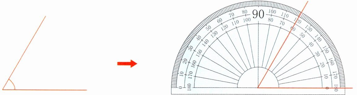 (2) 这个角是$60^{\circ}$。量角时要注意量角器的中心与角的顶点重合,量角器的$0^{\circ}$刻度线与角的一条边重合,看角的另一条边对应的刻度时要分清是内圈还是外圈。