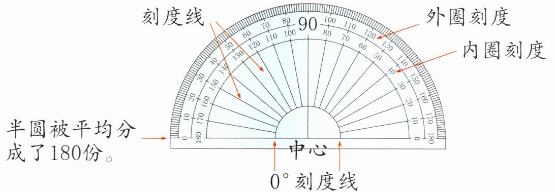 (1) 量角器上有中心、刻度线(包括内圈刻度和外圈刻度)、$0^{\circ}$刻度线等。把半圆分成$180$等份,每一份所对的角是$1$度的角,“度”是角的计量单位,用符号“$^{\circ}$”表示。