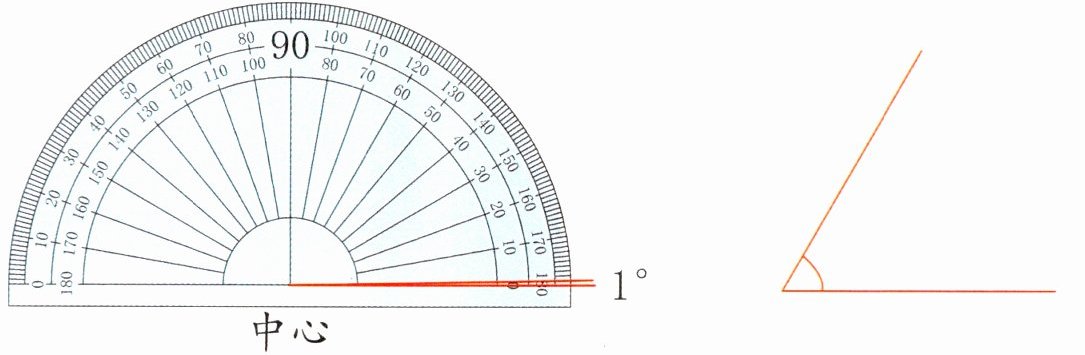 (1) 量角器上有中心、刻度线、$0^{\circ}$刻度线等,把半圆分成$180$等份,每一份所对的角是$1$度的角,“度”是角的计量单位,用符号“$^{\circ}$”表示。