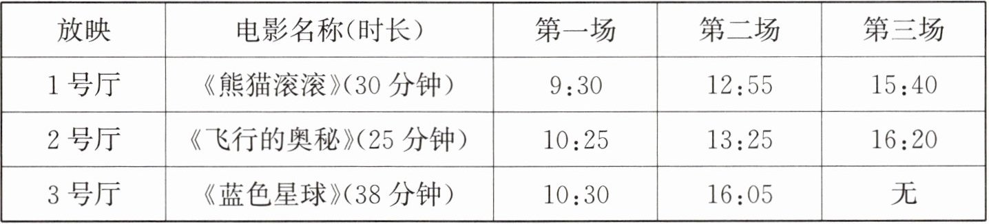(3)毛毛15:30到达售票点,这一天他在儿童剧场最多可以完整地观看哪几部电影? ( )。