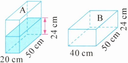 思路分析 方法一:不管怎么倒水,水的体积不变。可以将两个鱼缸并排放在一起,将有水的部分看成是一个长$(20 + 40)$厘米、宽50厘米的长方体(如图)。由“长方体的体积= 底面积×高”可知,“长方体的高= 体积÷底面积”,从而计算出现在的水深。