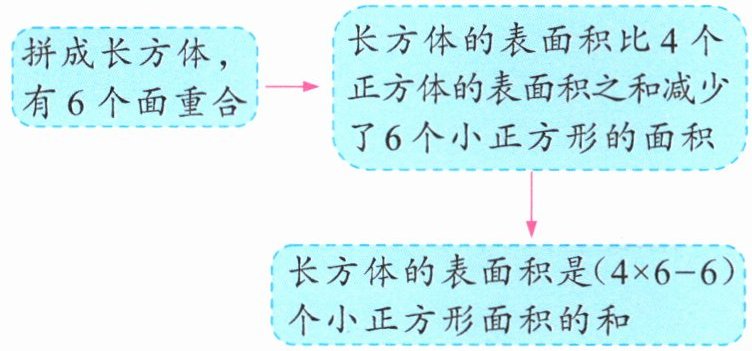 通过观察可知,把$4$个完全一样的正方体拼成一个长方体,有$6$个面重合,所以长方体的表面积比$4$个正方体的表面积之和减少了$6$个小正方形的面积,由此求出正方体一个面的面积,进而求出一个正方体的表面积。