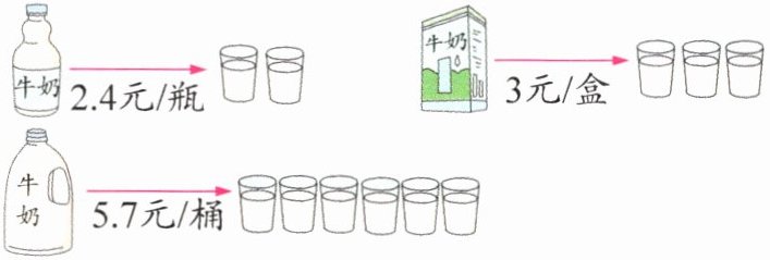2.4÷2=1.2(元/杯) 3÷3=1(元/杯) 5.7÷6=0.95(元/杯) 0.95<1<1.2 桶装最划算,因为平均到每杯牛奶的价钱最低。