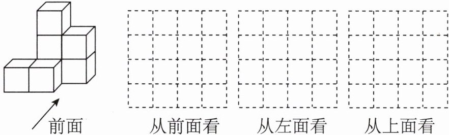 4. 如图是由7个相同的小正方体搭成的几何体. 请在对应的网格中画出从前面、左面和上面看这个几何体得到的形状图.