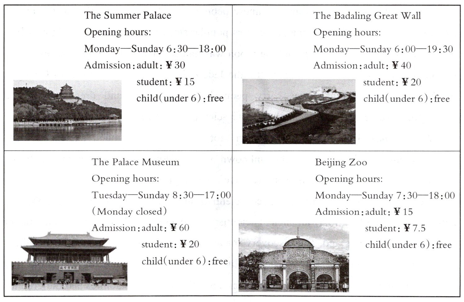 David is a student aged 14. He and his parents are going to travel around Beijing this summer. Below is some information that they have got.