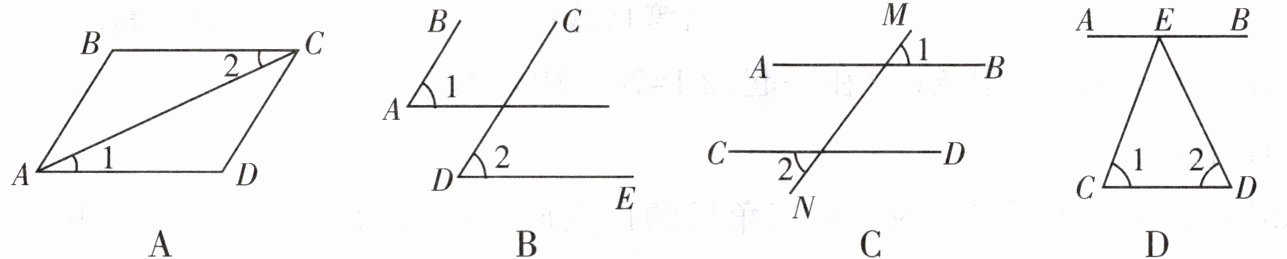 7. 下列图形中,由$∠1=∠2$,能得到$AB// CD$的是(