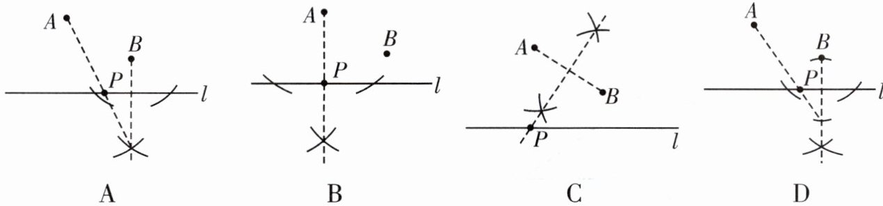 7. 已知点$A$,点$B$都在直线$l$的上方,用尺规作图在直线$l$上作一点$P$,使得$PA + PB$的值最小,则下列作法正确的是(