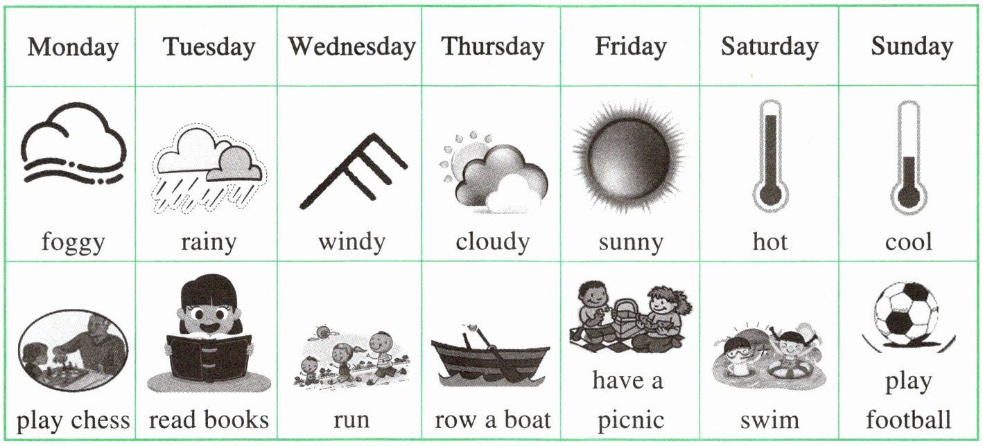 1.rainy 2.read books 3.windy 4.run 5.cloudy 6.row a boat 7.sunny 8.going to have a picnic 9.will be hot 10.going to swim 11.it will be cool 12.I'm going to play football