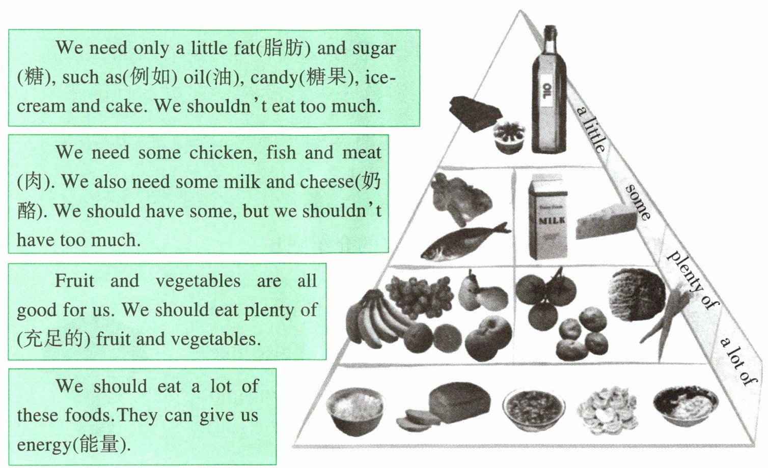 We need only a little fat(脂肪) and sugar (糖), such as(例如) oil(油), candy(糖果), ice-cream and cake. We shouldn't eat too much.