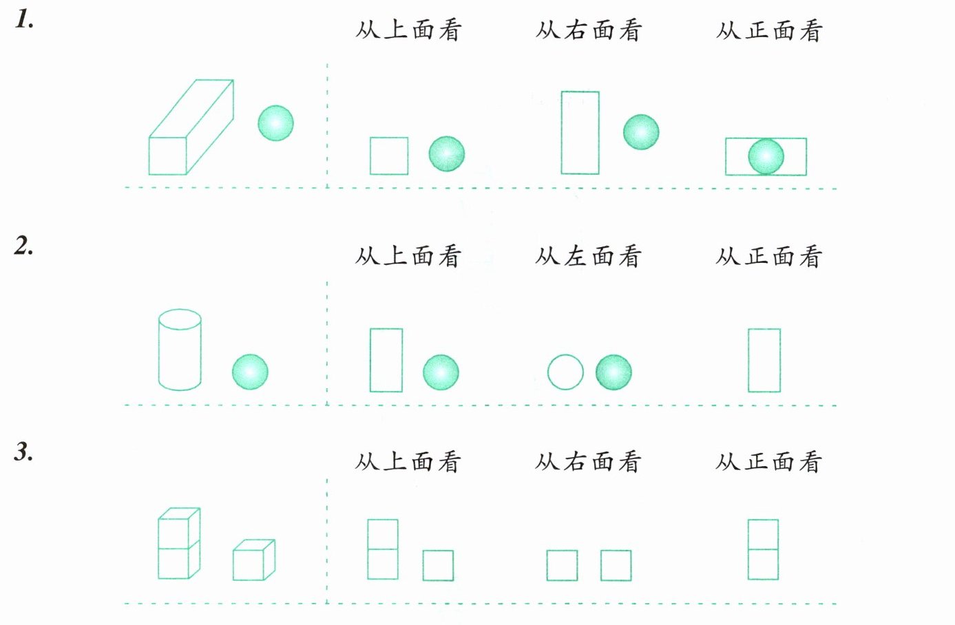 2. 对于第二个物体,从上面看,看到的是圆柱的上面(一个圆)和球,对应第二个图形(圆和球);从左面看,看到的是圆柱的侧面(一个长方形)和球,对应第一个图形(长方形和球);从正面看,看到的是圆柱的正面(一个长方形),对应第三个图形(长方形)。