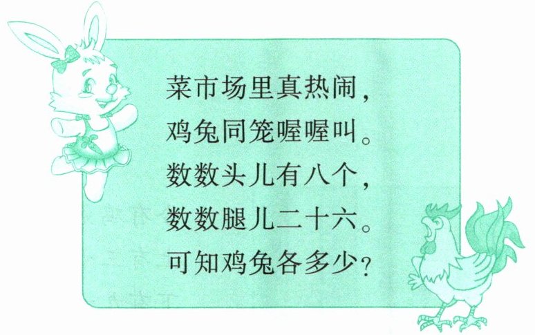 鸡兔同笼,数它们的头共有2个头,数它们的腿共有6条。想想:有几只鸡?有几只兔?
