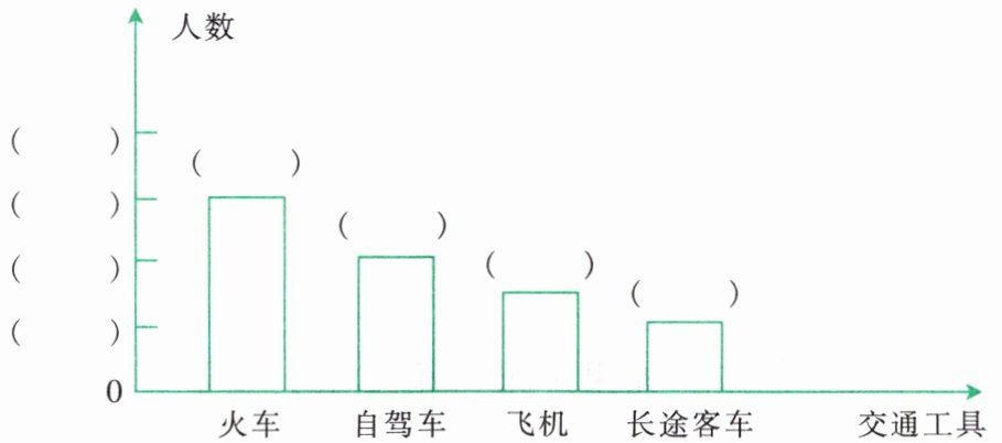 火车有$4$格,人数为$500×4 = 2000$人;自驾车有$3$格,人数为$500×3 = 1500$人;飞机有$2$格,人数为$500×2 = 1000$人;长途客车有$2$格,人数为$500×2 = 1000$人(这里火车比长途客车多$1000$人符合题意)。