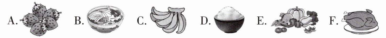 三、Read and choose. 午饭时间就要到了,Huanhuan 一家想吃些什么呢?请你读一读,选择对应的图片,把序号写在横线上。