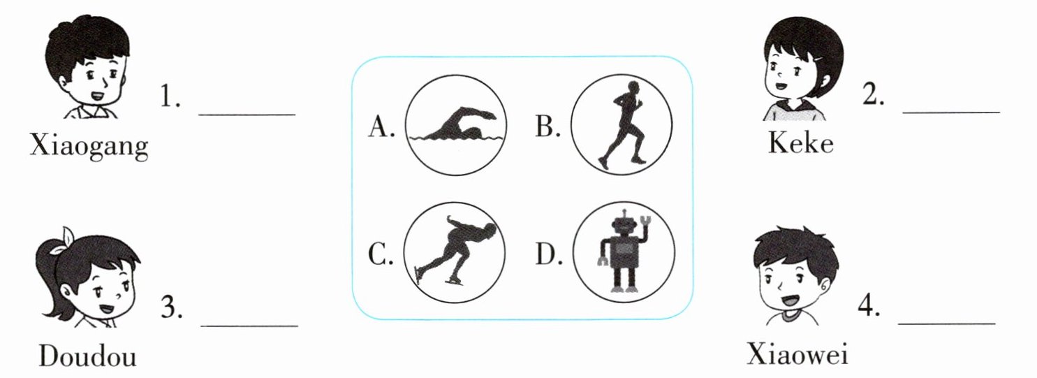 三、Read and choose. 校园小记者 Xiaoyu 正在了解同学们的爱好是什么。请你读一读, 选出对应的图片, 把序号写在横线上。