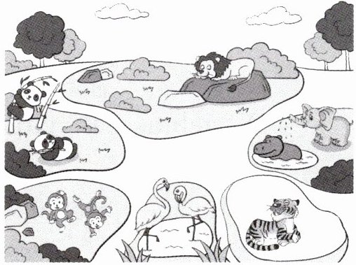 Look! There are many animals in the picture. There are two pandas. One is eating bamboo, and the other is lying on the grass. A lion is sleeping on a rock. An elephant is drinking water. A hippo is in the water. Two monkeys are playing in the tree. There are two flamingos standing near the water. A tiger is sitting on the grass. They are all very lovely.