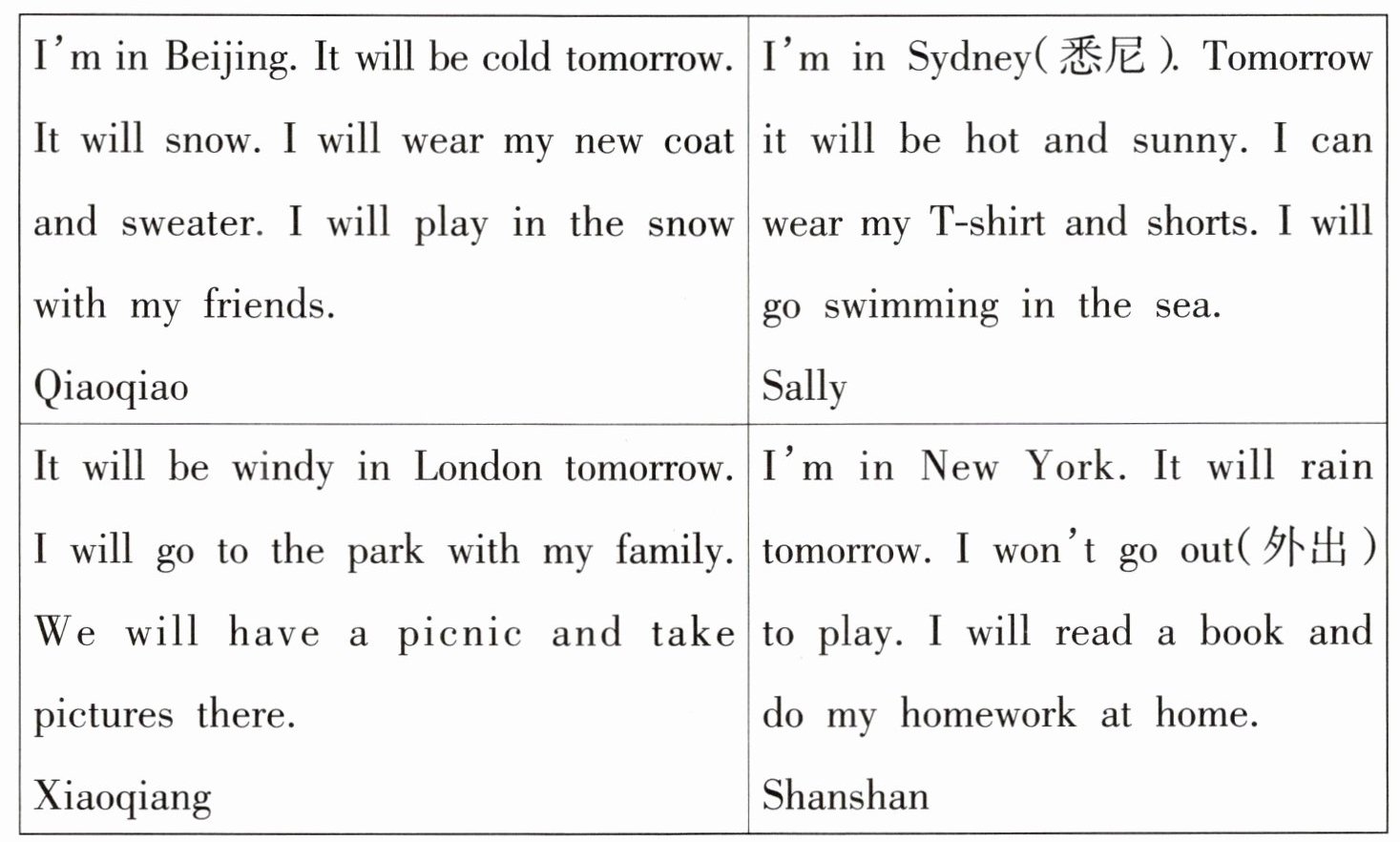 )3. Xiaoqiang will have a picnic in the park tomorrow.(