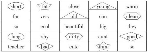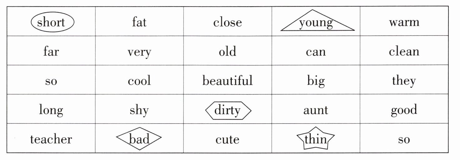 一、Read and draw. 同学们正在玩“反义词消消乐”的游戏。请你读一读,用相同图形标出已作标记的单词的反义词。